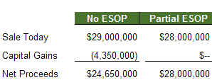 Additionally, the selling shareholder has an opportunity to defer all of their capital gains taxes in the sale to an ESOP. If the shareholder is able to take advantage of this tax benefit, the net proceeds from the partial ESOP sales strategy would exceed that of the hold strategy, while diversifying shareholder risk.