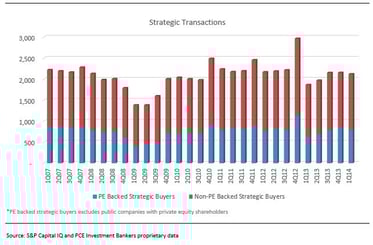On a rolling 12-month basis through the first quarter of 2014, total transaction volume was approximately 9,100 deals, compared to the year prior which was more than 10,100. From a value perspective, of the deals that disclosed transaction values (~ 24% of strategic buyers and ~ 23% of PE buyers), the market observed an increase in dollar volume. Total transactions value increased from $746 billion to $821 billion on a rolling 12-month basis through first quarter of 2014 over the first quarter of 2013. The increase in total transaction value was primarily driven by strategic transactions. On a rolling 12-month basis, strategic value was $731 billion through first quarter of 2014, compared to $679 billion for the same timeframe through the first quarter of 2013.