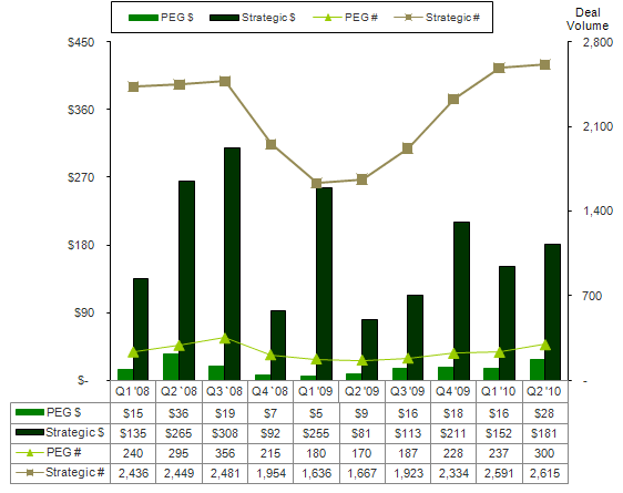 In 2Q10, strategic and financial investors increased the dollar value of their investments and transaction volume. Financial investors increased acquisitions dollars by 75% in 2Q10 versus 1Q10, while the total number of transactions increased by 26.6%. Strategic investors were also more active by both measures with the dollar value of acquisitions increasing 19.1% and total volume expanding 0.9%. Average deal size for strategic and financial investors grew in 2Q10. Private equity transaction size expanded 38.2% from $67.5 million in 1Q10 to $93.3 million. Meanwhile, the average strategic transaction value increased 17.9% from $58.7 million to $69.2 million over this same period.