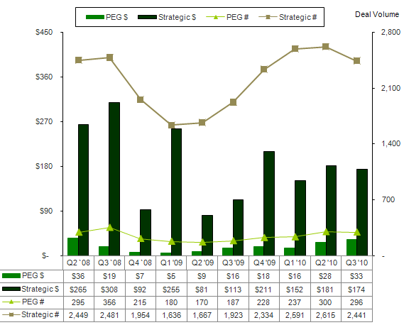 In 3Q10, strategic and financial investors moved in slightly different directions. Financial acquirers increased the dollar value of their investments by 18% to $33 billion while total transactions decreased 1% to 296. As a result, the average transaction size increased from $93.3 million in 2Q10 to $111.5 million; an increase of 20%. Meanwhile, strategic acquirers decreased the dollar value and volume of transactions in 3Q10 by 4% and 7%, respectively. The larger drop in the total number of transactions versus dollars invested led to an increase in transaction size as well. In 3Q10, total transaction size increased 3% from $69.2 million to $71.3 million. A number of factors could be influencing this, including: active financing markets, higher quality companies on the market, strong cash positions on balance sheets, and attractive valuations.