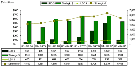 The mergers and acquisitions markets were forced to step back and evaluate where they stood following the credit crisis in the second half of 2007. After some introspection, it appears that the market for middle market companies (value < $250 million) remains vibrant. While larger transactions (value > $250 million) suffered due to deteriorating credit markets and company performance (i.e. SLM Corp., United Rentals, Harman International, Acxiom), strategic and financial acquirers still exhibit strong appetites for quality assets. Buyers are on the lookout for companies with good product/service mixes that fill a market need and provide strong cash flow. Financial acquirers flush with cash and strategic buyers with strong balance sheets continue to seek desirable opportunities. While there has been some impact on valuations and debt levels, particularly multiples for acquisitions under $50 million, transaction levels and pricing remain lively. In addition, fears of a recession as well as the recent market correction will affect mergers and acquisitions activity, but will be partially offset by the resulting lower interest rates. Together these factors project an active market for mergers and acquisitions in 2008, although off previous highs.