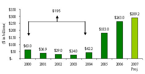 The middle market benefited from a multitude of factors including, lower debt levels, limited need to syndicate loans and the continued presence of strategic and financial buyers. It remained active, despite temporary moderation due to the credit crisis. As the table above demonstrates, middle market transaction volume is well within levels seen during 2006 and at, or above, 2004 and 2005 for all value segments. The data also demonstrates multiples are well within the ranges seen during the recent boom. The only exception would be the decrease in multiple for transactions under $50 million in the fourth quarter of 2007. Valuations in this segment remain healthy, but warrant on-going evaluation.