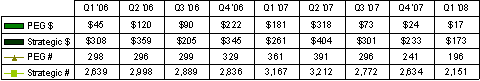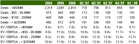 Improving Valuations? It appears that the lower multiples private equity groups typically may pay have been offset by strategic buyers. Valuations have improved over Q4’07 in the middle market in most segments and remain healthy in all segments, supporting the thesis that buyers are willing to pay for quality. However, the jagged movement of the multiples makes it difficult to spot trends. The most notable increase is among companies with valuations below $50 million. EBITDA multiples improved from 7.9x to 8.7x during Q4’07 to Q1’08. The most notable decline was in the $50 million to $99.99 million segment which decreased from 11.7x in Q4’07 to 8.1x in Q1’08.