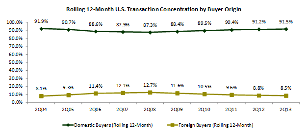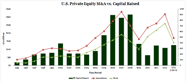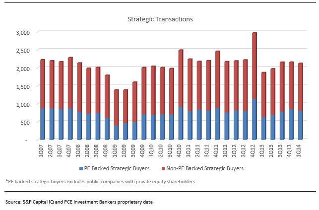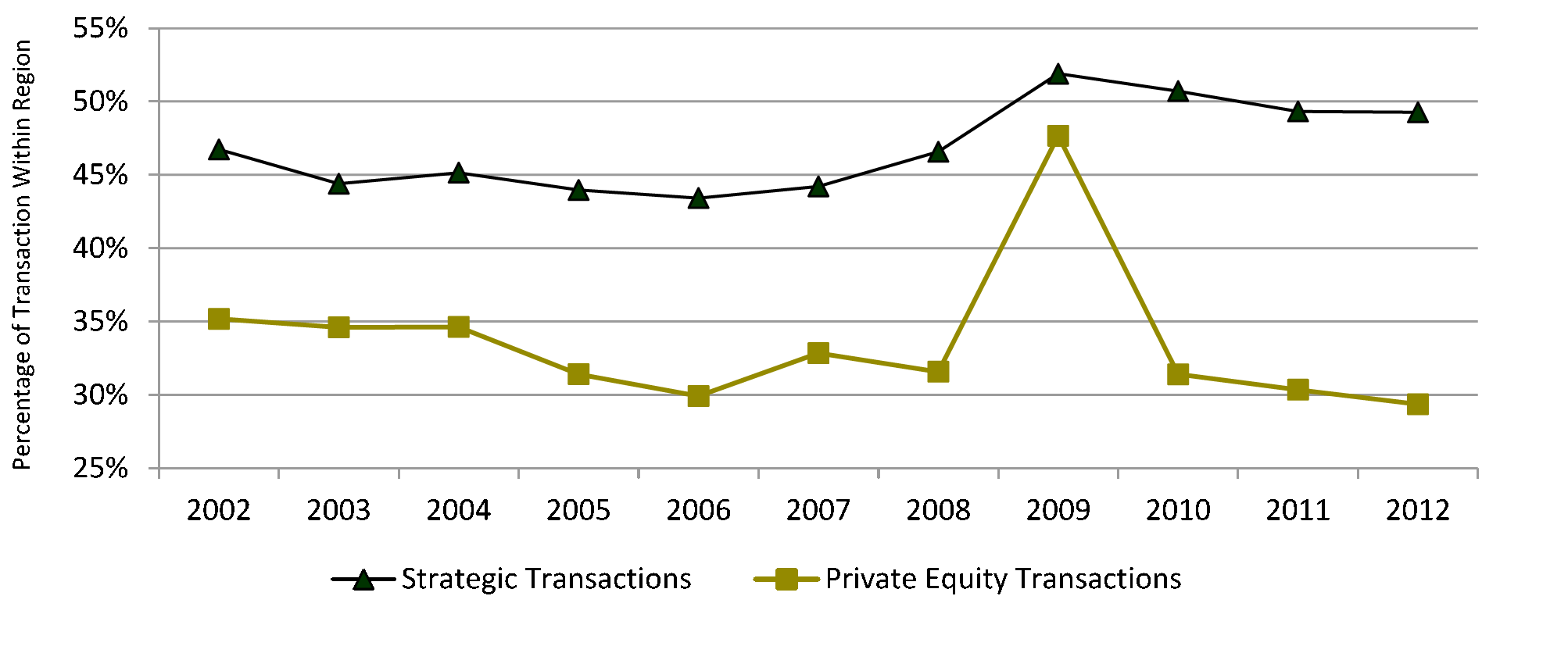 Private Equity (PE) has a strong influence on the M&A market that goes beyond the initial platform transaction (PE Platform Transactions). PE Platform Transactions have steadily represented a low percentage of the total transaction volume over the past few years. Since the beginning of 2007, PE Platform Transactions have stayed within a band of 8% to 10% of total transaction volume on a quarterly basis. This data would lead one to believe that PE’s influence on the M&A market is minimal. However, a deeper analysis shows that PE portfolio companies represent a meaningful percentage of strategic acquisitions (PE Backed Transactions).
