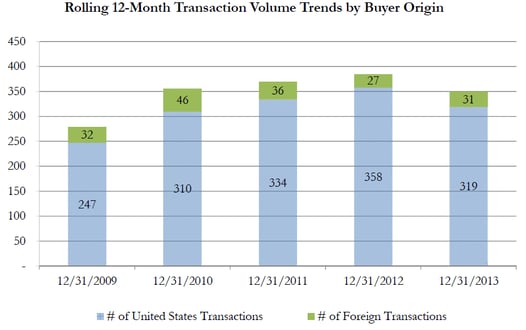 During the last twelve months through 12/31/13, foreign buyers represented about 10% of total transaction volume. These buyers have represented as much as 15% of transaction activity in that past five years (see chart below). We expect this current level of activity to continue.